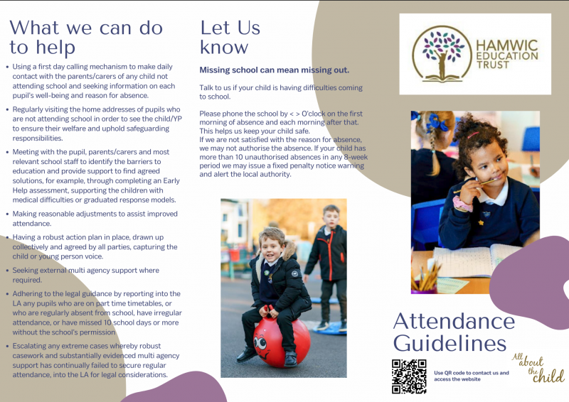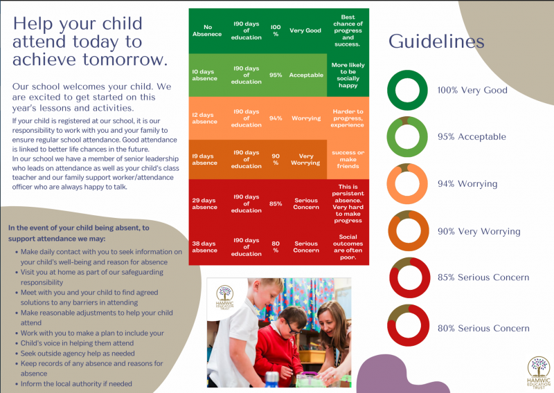 Improving attendance works best if it is a whole school approach. Attendance is a safeguarding matter and is therefore everyone’s responsibility. We must work together with our Parents/Carers, partners and communities to develop and maintain a whole school culture that promotes the benefits of good attendance.